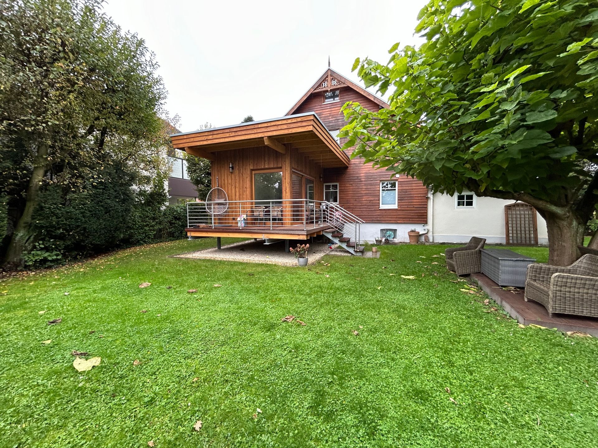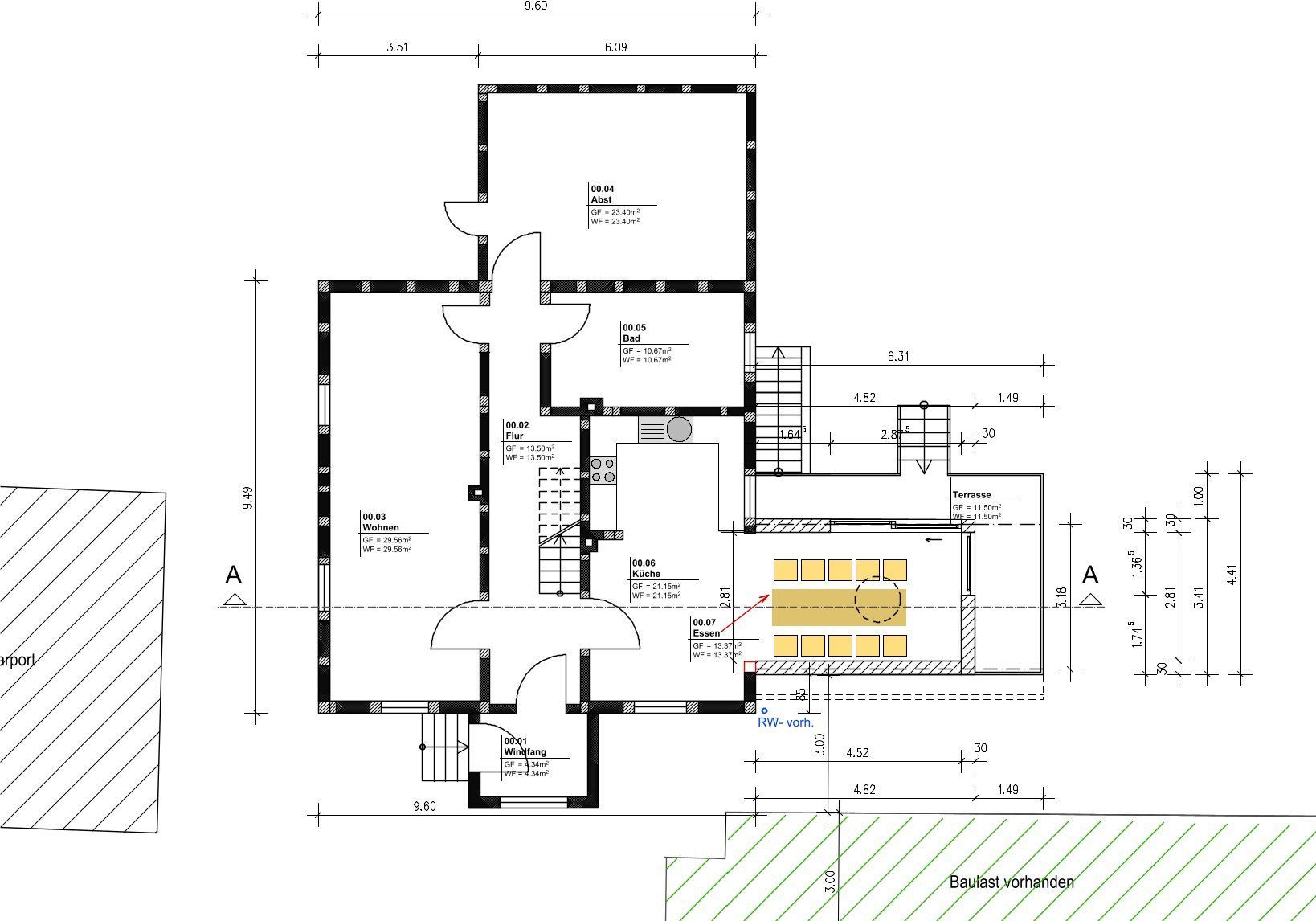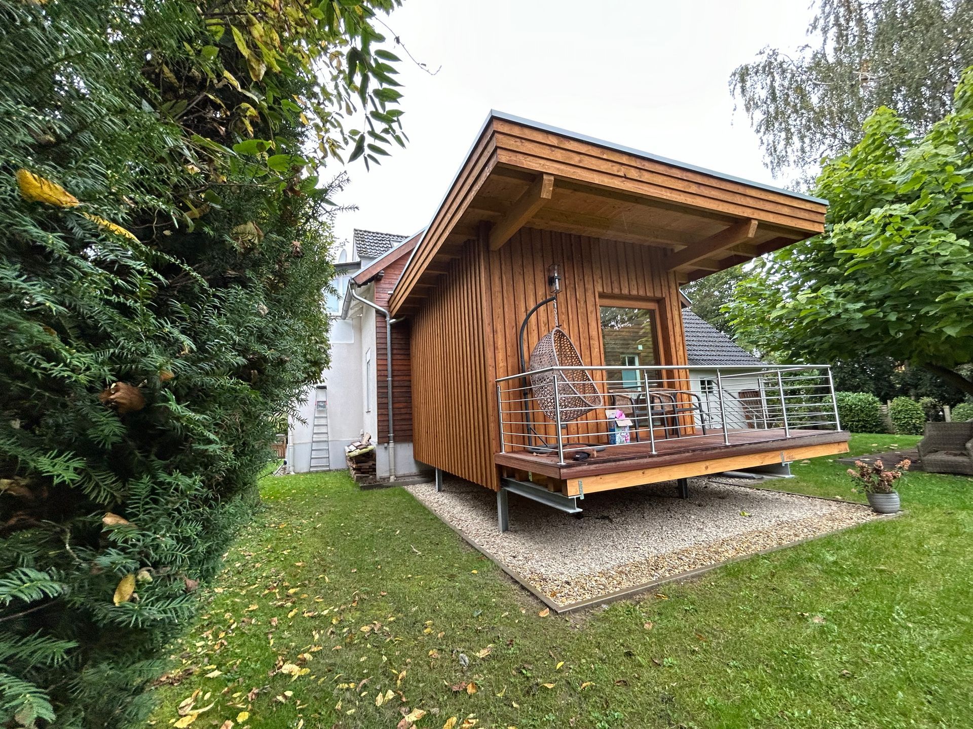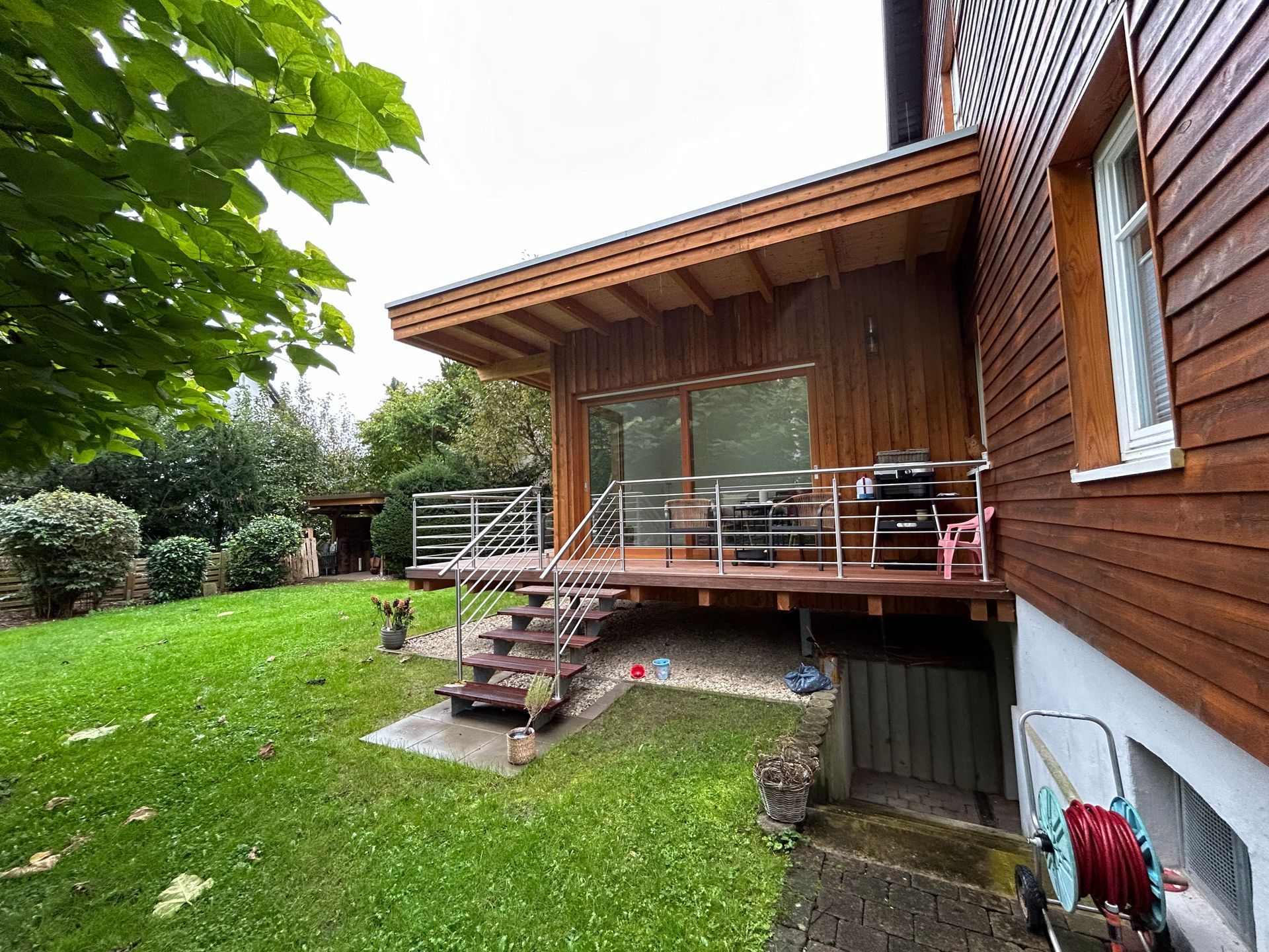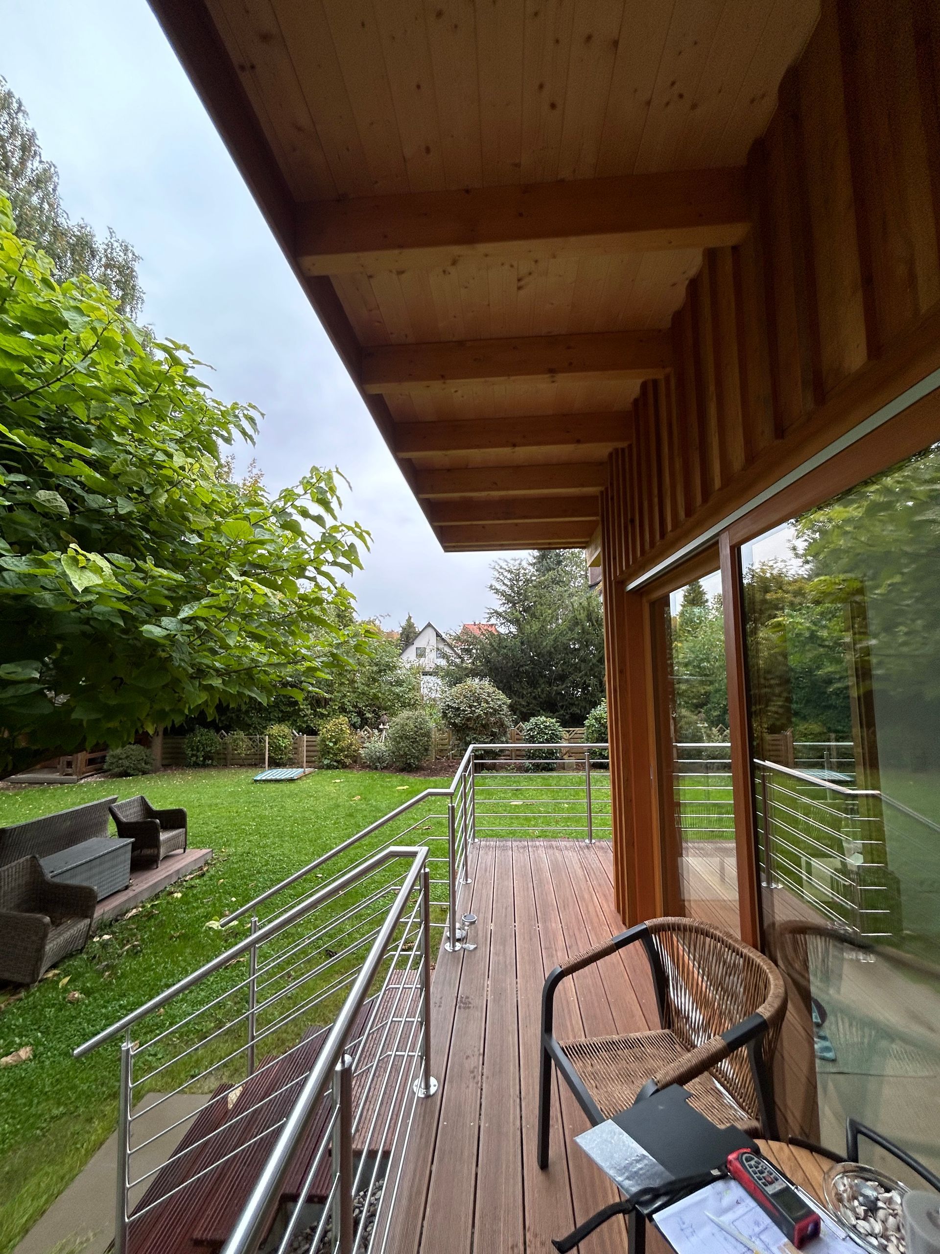 Es handelt sich um einen aufgeständerten Anbau als Wohnraumerweiterung ca. 14,00 m² in Holzrahmenbauweise mit Terassendeck ca. 11,50 m²und Freitreppenanlage.